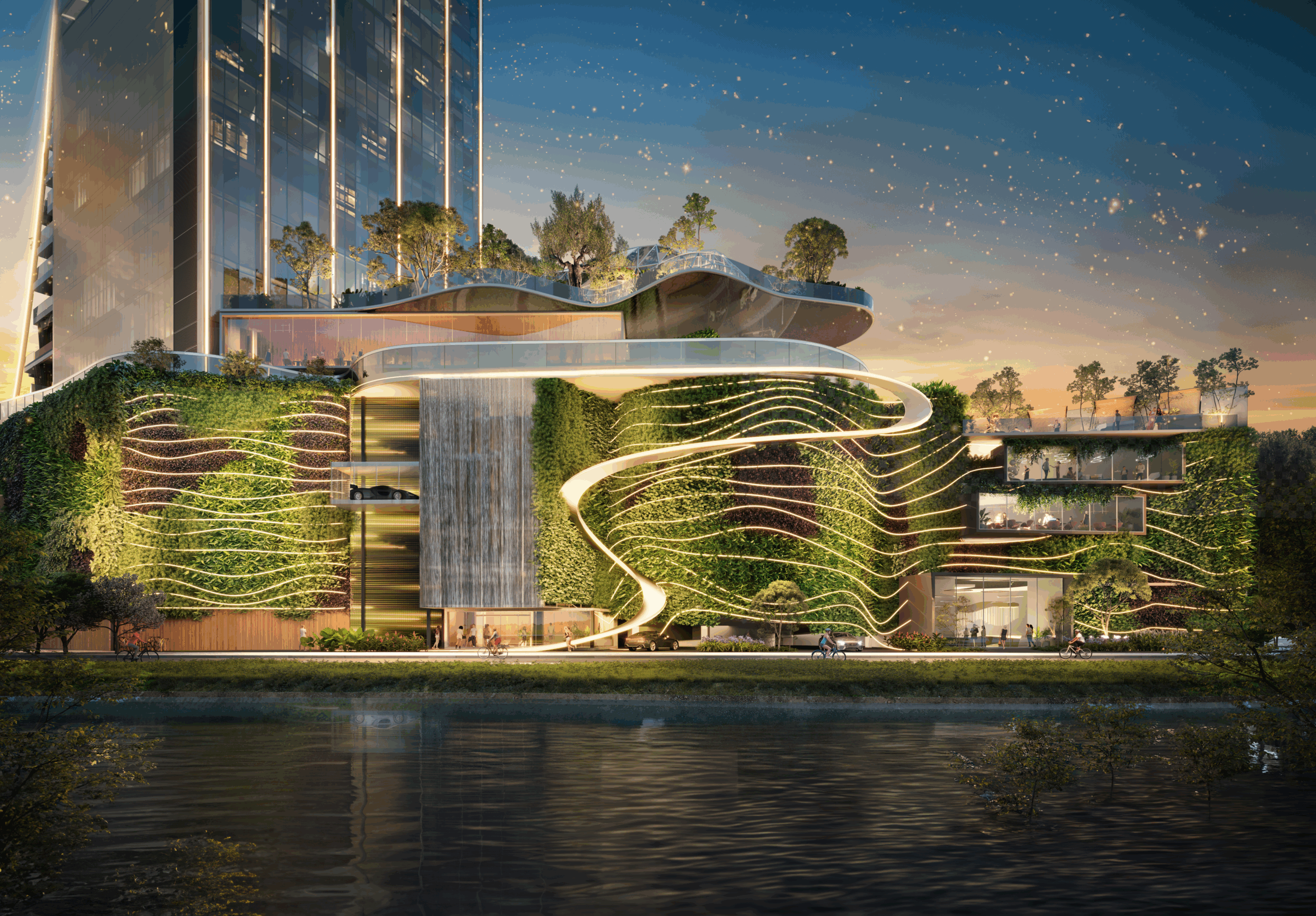 “A curva ascendente do edifício simboliza o movimento de superação em direção ao ideal, coroada por uma estrutura que representa a transição da matéria para a luz”, explica Lalalli.