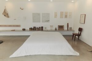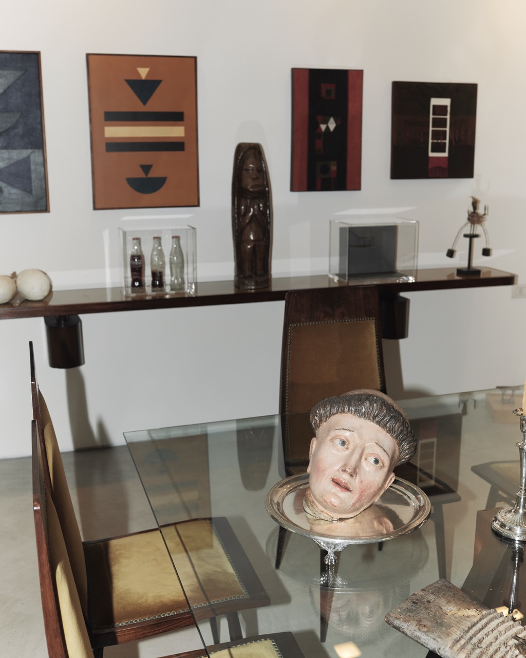 Uma escultura de grandes dimensões de Angelo Venosa divide espaço com os móveis, eles também marcados pela brasilidade autoral: uma cadeira de Flávio de Carvalho, um sofá de Joaquim Tenreiro, um sofá do Willys de Castro (“o único móvel que ele fez, para uma amiga dele, a galerista Mônica Filgueiras”). Algumas obras estão fora, emprestadas para exposições em museus dentro e fora do país.