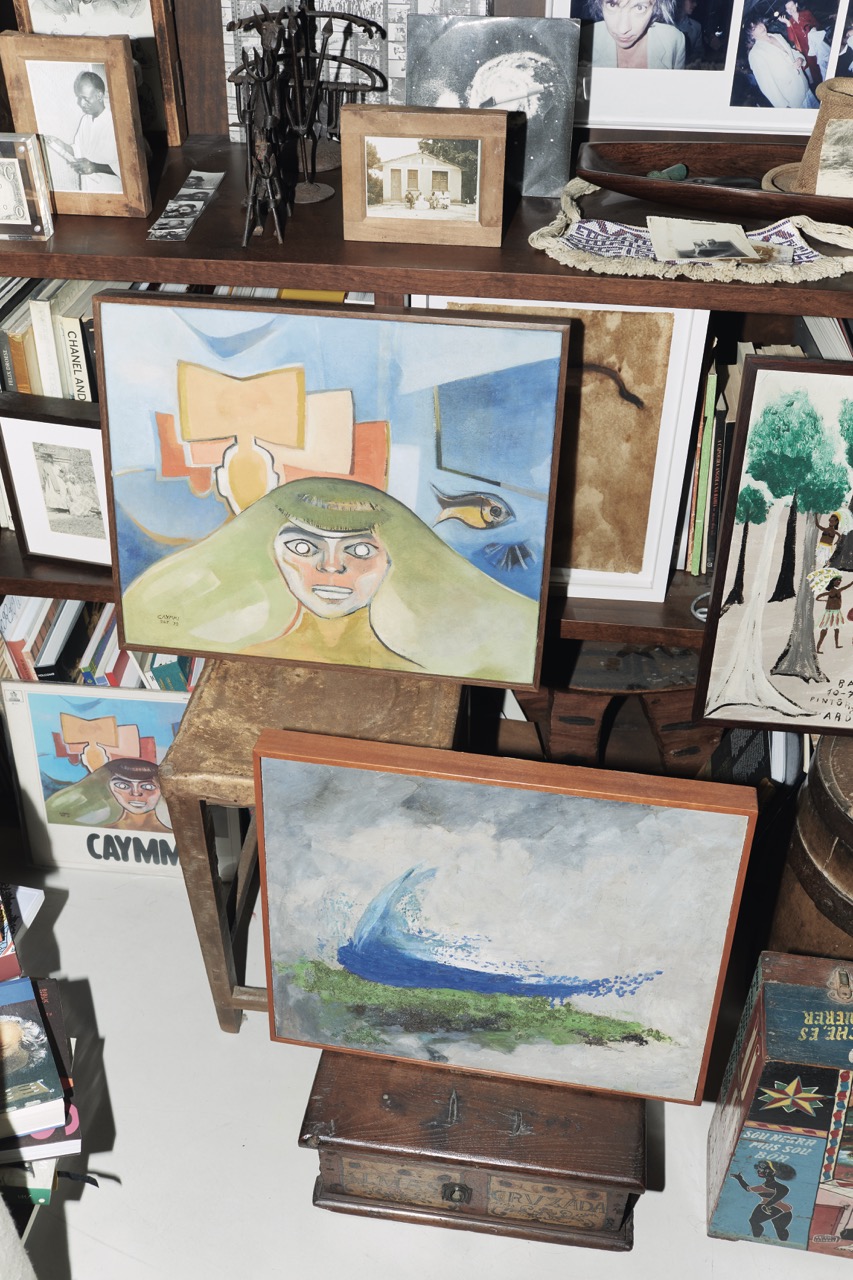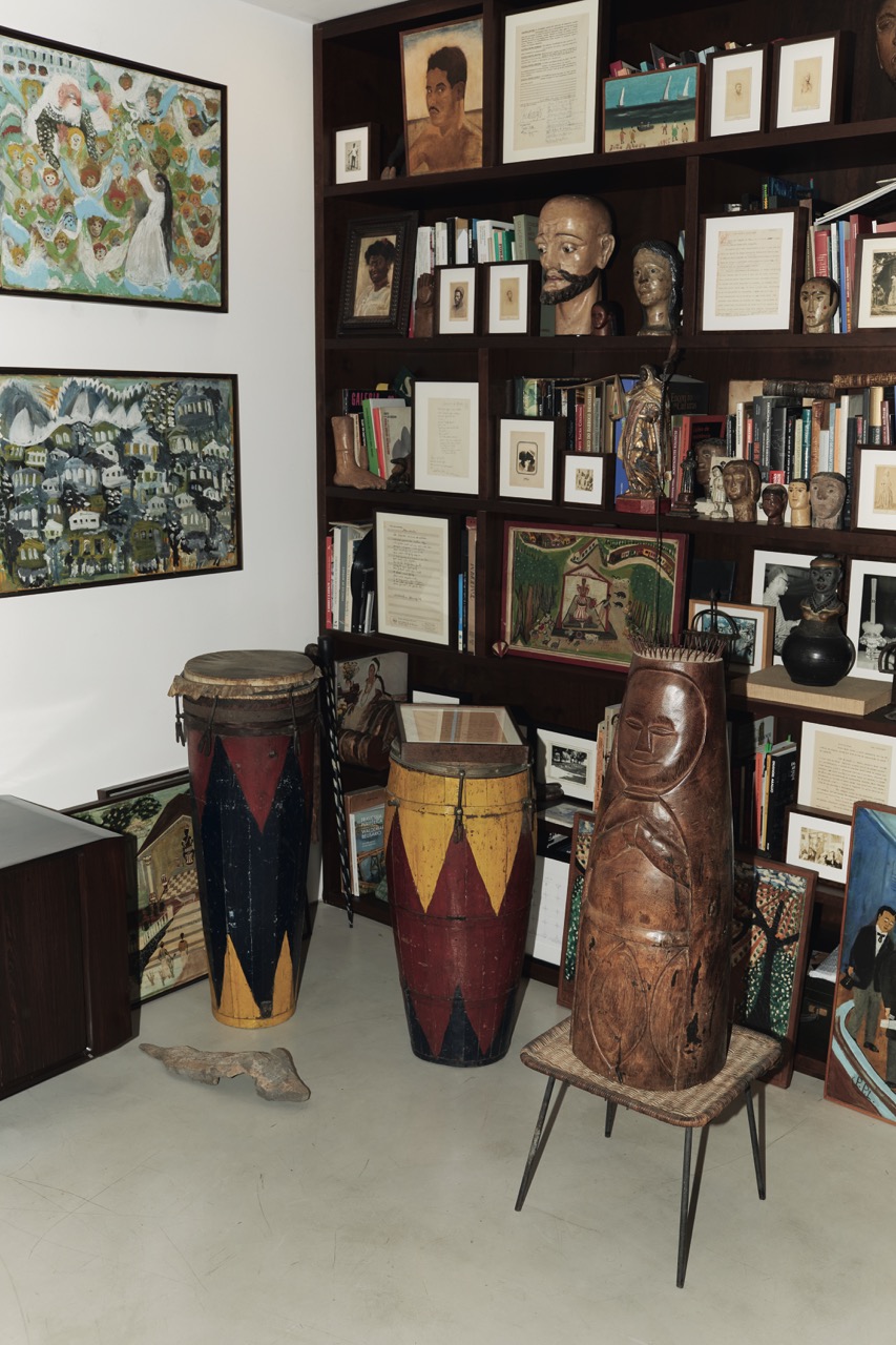 O apartamento de Rafael Moraes se debruça sobre a Avenida Paulista, seus prédios e seus fluxos. Mas as cortinas fechadas e a coleção de arte esparramada por toda parte nos convidam a outra viagem. São Brasis do passado, pequenas Áfricas, a Bahia de Caymmi, terreiros, arte conceitual dos anos 1970, fios de uma coleção que ele monta a partir do que define como “atravessamentos”. Ao entrar ali, já não sabemos bem em que tempo-espaço estamos.