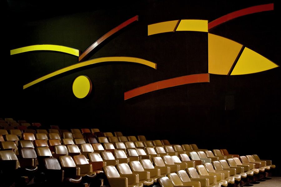 Além da fachada em azulejos, Athos Bulcão também assina o interior da sala de projeção. Ele utilizou faixas e losangos em relevo de madeira e gesso nas paredes laterais, criando uma textura que serve tanto como elemento visual quanto acústico.