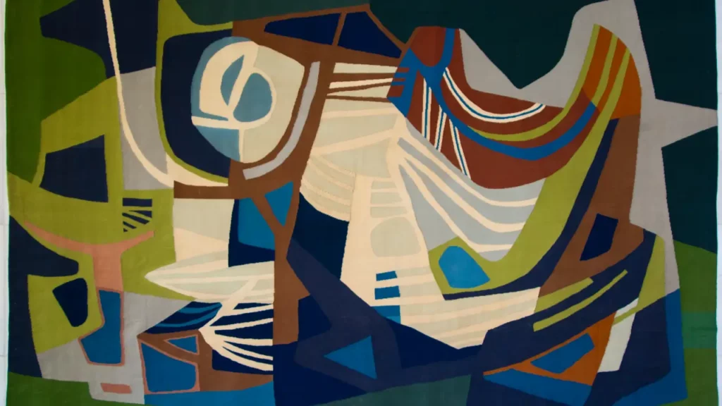Tapeçaria monumental de algodão com formas orgânicas e cores fortes que evocam a vegetação do Planalto Central.