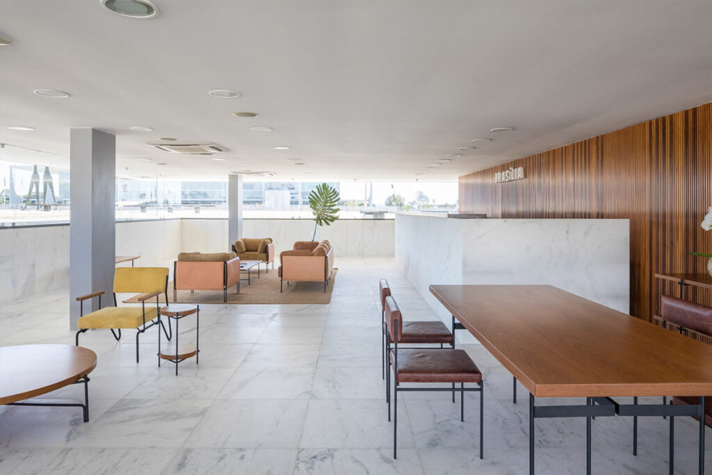Projetada por Oscar Niemeyer sobre o espelho d’água do Itamaraty, a Casa de Chá foi inaugurada em 1967 como pavilhão de recepções diplomáticas. Reaberta em 2024, em parceria com o Senac-DF, o espaço funciona hoje como café-escola, unindo gastronomia, formação e patrimônio modernista. O ambiente preserva o mobiliário original de Sergio Rodrigues, Tenreiro e Zalszupin, e mantém o jardim de Burle Marx, reunindo em um só lugar parte do acervo artístico e arquitetônico que define o conjunto do Itamaraty.